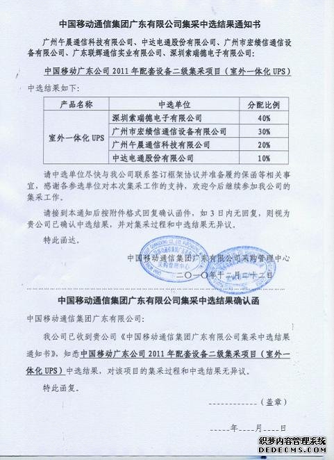 UPS大型制造商及UPS专业解决方案专家——hth华体会体育官网入口,以绝对的厂商实力、专业快捷的售后服务在中国移动广东公司2011年集采入围项目中以最大份额中标。