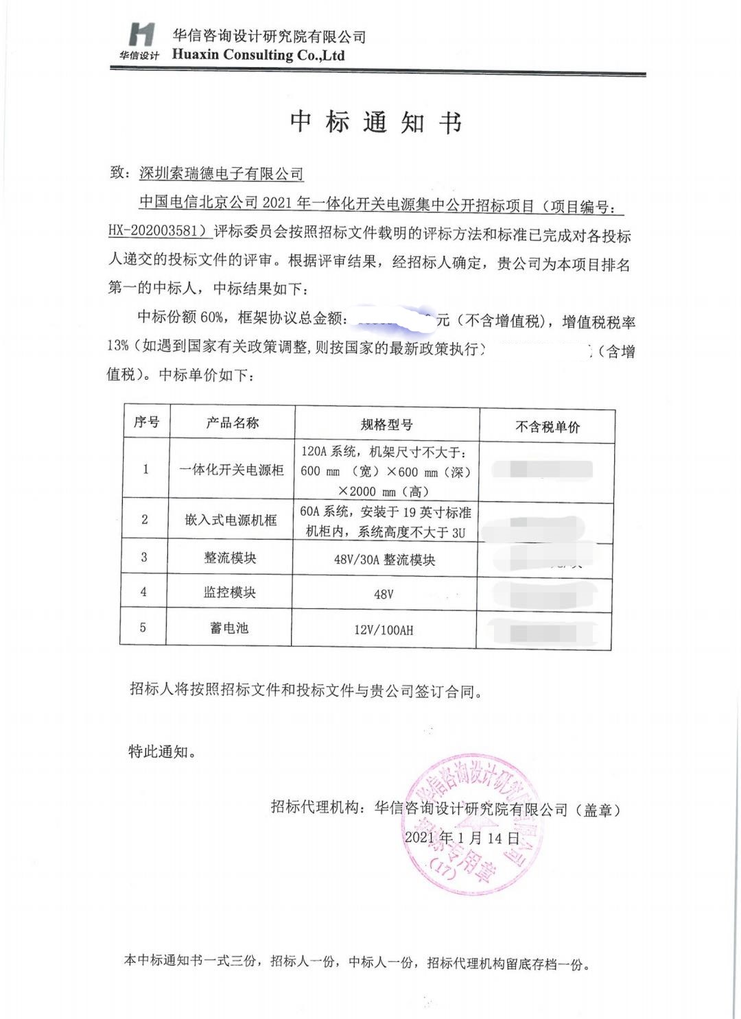 喜讯!hth华体会体育官网入口成功中标北京电信2021年一体化开关电源采购项目;